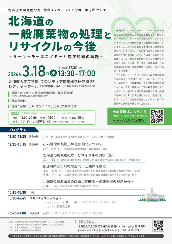 2026年3月18日(水)13時半より北海道大学寄附分野循環イノベーション第3回セミナーを開催いたします。今回のセミナーは「北海道の一般廃棄物の処理・リサイクルの今後 ~サーキュラーエコノミーと適正処理の課題~」をテーマに、循環経済(サーキュラーエコノミー)を環境保全と経済成長を両立させる国家戦略として掲げられ、カーボンニュートラルとネイチャーポジティブと一体となった持続可能な社会構築が望まれており、これまでとは異なる多種多様な取組が推進されている一方で、一般廃棄物の適正処理と資源化を担う自治体において、人口減・高齢化・財政難・人不足・施設の老朽化など多くの課題が浮き彫りになってきました。また、日本海溝・千島海溝周辺の地震、豪雨豪雪など災害のリスクも高まっています。そのような背景や課題のある中で、北海道らしいサーキュラーエコノミーのあり方、災害廃棄物も含む平時の適正処理のあり方、さらに廃棄物の分別や資源回収のあり方まで、少し幅広に皆様と問題共有する場、課題改善のために考える場を設けました。会場のみならず、オンライン併用で開催しますので、多くの皆様のご参加をお待ち申し上げます。