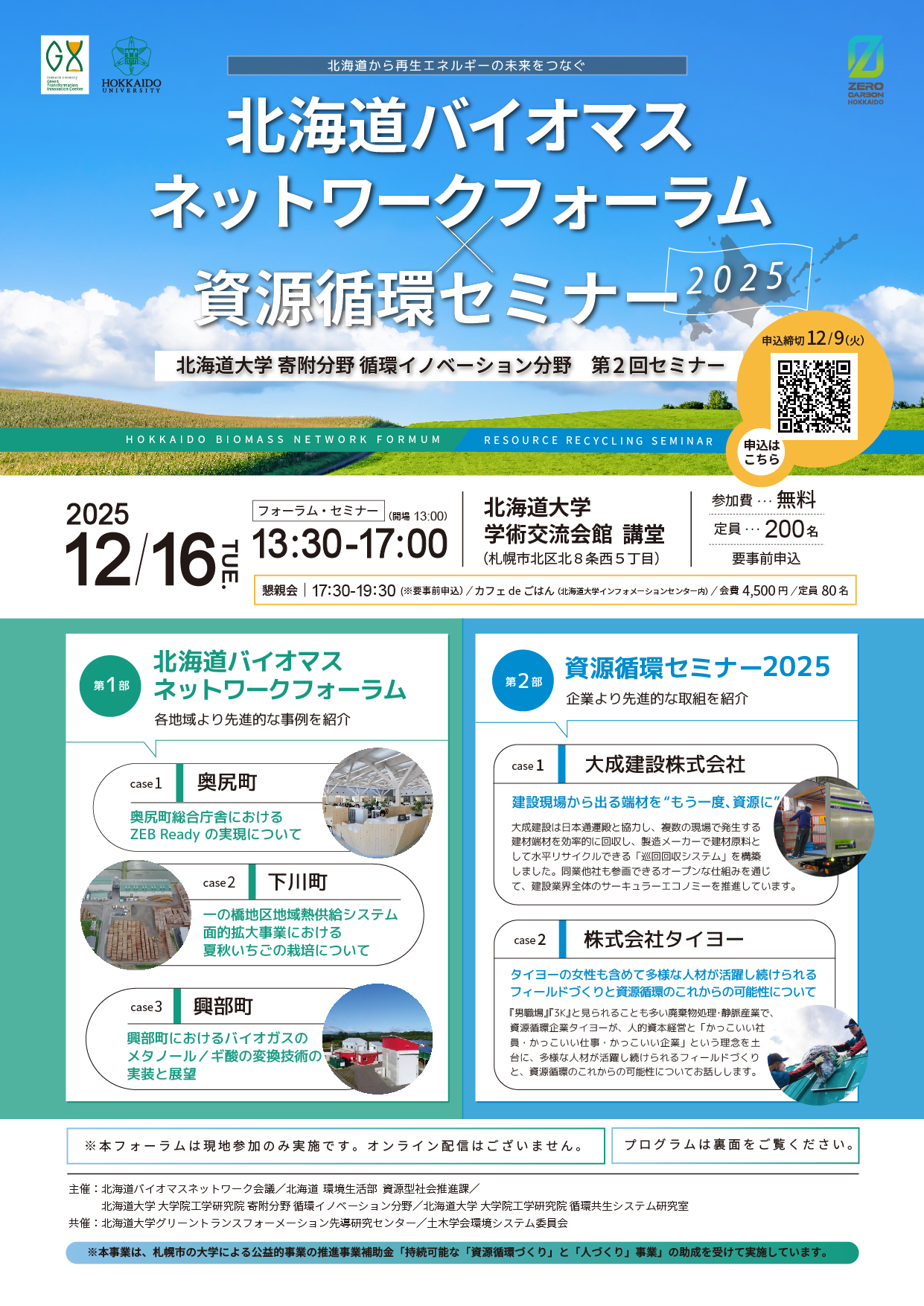 20251216_flier_HP1_20251125 投稿日: 2025/11/25 サイズ: 1241 × 1754 エントリ: 北海道バイオマスネットワークフォーラム×資源循環セミナー2025×循環イノベーション分野第2回セミナー開催のご案内(12/16)